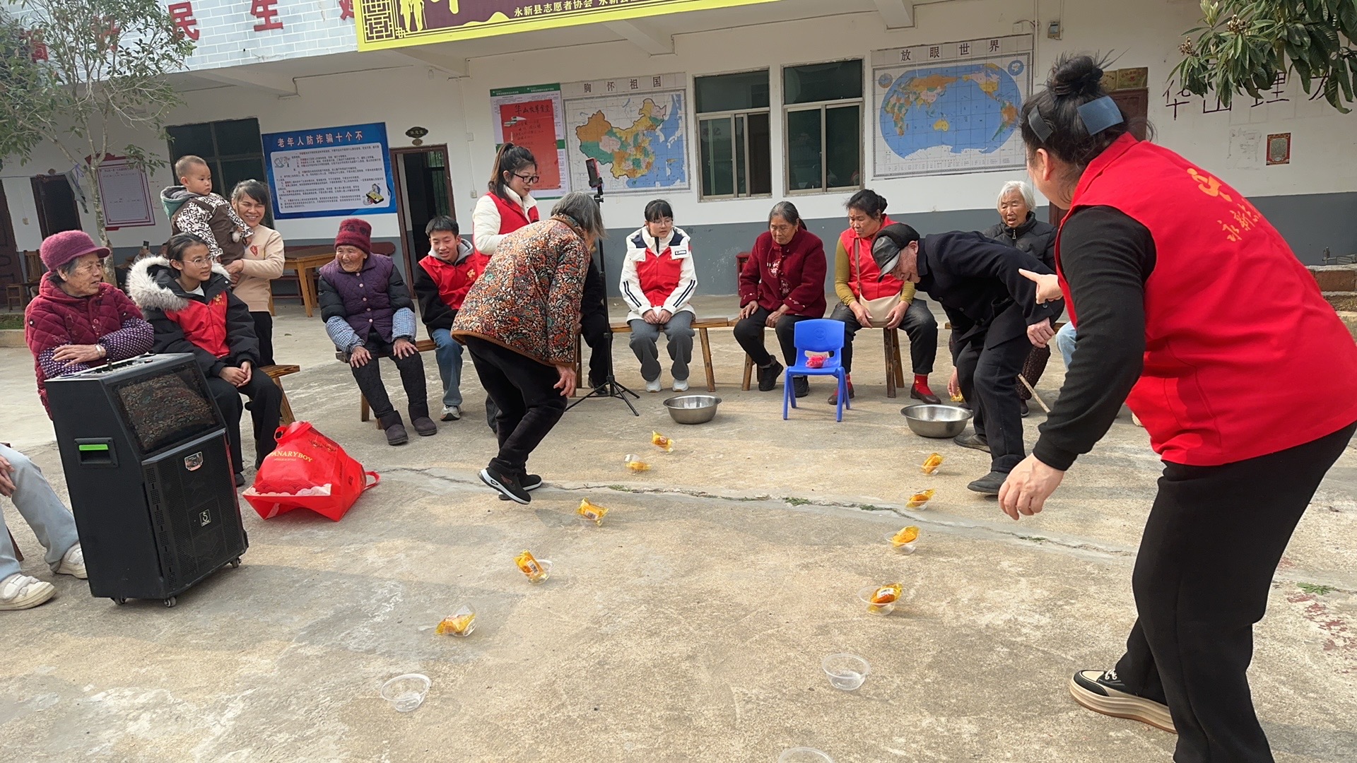 活动在轻松愉快的健康手指舞中拉开帷幕。大家围坐成圈,跟随着节奏舒展手指,欢笑声此起彼伏。紧接着是趣味十足的丢球游戏,老人组与学生组轮番上阵,一老一小默契互动、其乐融融。获胜者收获的是一根甜甜的棒棒糖,甜蜜写满每一张笑脸。